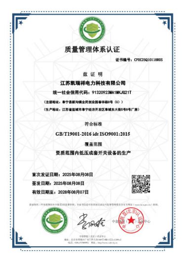 公司擁有數控沖床、數控剪板機、數控折彎機、自動化噴涂設備、高低壓檢測設備。公司全面貫徹執行標準管理體系,低壓系列產品取得了 強制性認證證書,中高壓系列產品取得 型式試驗報告。在電氣行業快速發展的 ,因市場的需要,現公司又投資創辦了江蘇凱瑞祥電力工程有限公司,主要經營:高低壓開關柜、電容柜、環網柜、儀表等,公司將更好更全面的服務好廣大客戶。